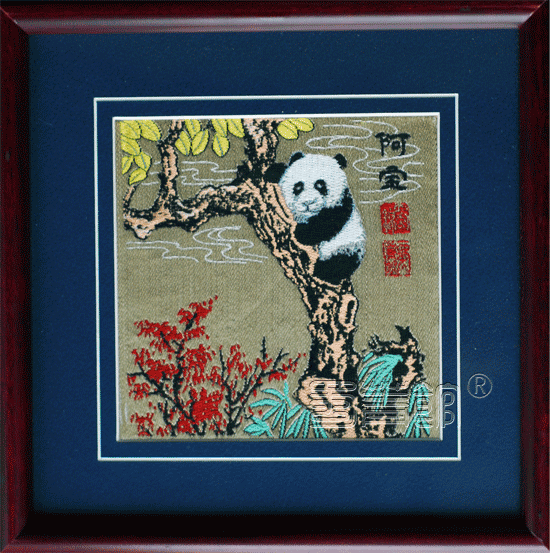 蜀锦《阿宝》截取蜀菁馆版权图案《蜀山逸趣图》部分画面,以传统七重纬工艺织造而成,画面清新明快,色彩艳丽缤纷,非常写实地体现出大熊猫幼崽的顽皮可爱,是一幅小巧精致的传统工艺品。