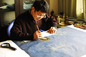 我们力图以传统工艺更加完美地再现《无量寿佛图》,进行了长达三年多的艰苦摸索,并有幸得到北京雍和宫图布丹大师等高僧大德的帮助支持,图布丹大师还先后两度为蜀锦设计稿和成锦诵经加持,使蜀锦《无量寿佛图》更兼具了礼佛珍品的特质,在此再次躬身致敬!