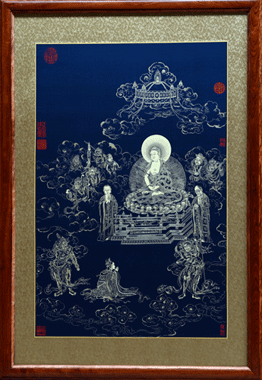 《无量寿佛图》为瓷青纸金画,虽题为《无量寿佛图》,实为如来佛图。该画中心佛祖慈目安详,两旁侍立迦叶、阿南二弟子,周围分布哼哈护法之神,前面女供养人虔诚礼拜,佛祖的平和与天神的威严形成鲜明对比,画面布局精巧,线条流畅细腻,不失为一传世大作。