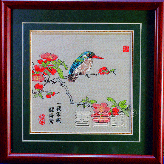 海棠在四川有很长的种植历史。大文豪苏东坡有“只恐夜深花睡去,故烧高烛照红妆。”的咏海棠之句。蜀锦海棠图以花期早于桃李的贴梗海棠为摹本,加以川西地区最美丽的禽鸟翠鸟为点缀,表现出初春时节万物复苏、生机勃勃的景象。
