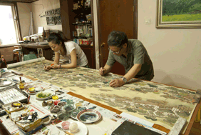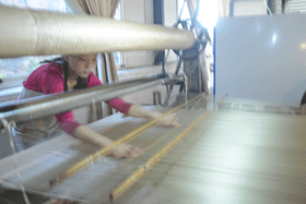 四川蜀菁文化传播有限公司在成功完成《明皇幸蜀图》 (钓鱼台国宾馆收藏)、《无量寿佛图》(雍和宫图布丹大师收藏)基础上,大胆创新,用蜀锦七重纬表现出了《交子行市图》设计稿丰富的色彩,工艺上除充分应用“七梭三十六色”传统技法外,还大量换套,四米彩卷二十余次换套,创造了单位面积换套最多、提花交织次数最多、晕色应用最多等多项蜀锦工艺记录,并开创性地采取纬线排序倒置的技法,使文字和图案底色出现变化。