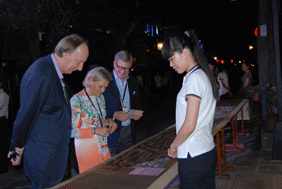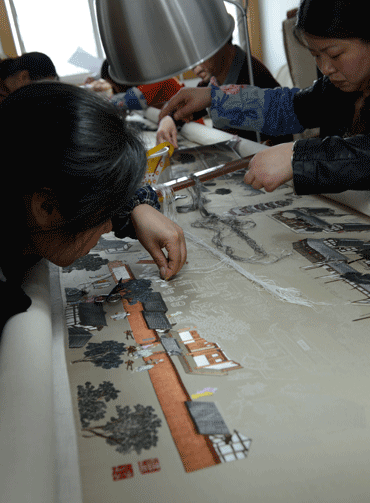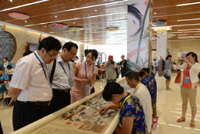 蜀锦《交子行市图》在成都举办的世界《财富》论坛和第四届国际非遗节上,受到中外人士的广泛赞誉,被誉为“成都版的《清明上河图》” |