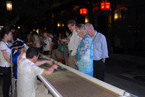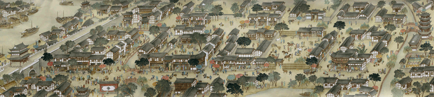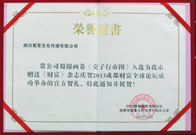 《交子行市图》以世界第一张官方纸币“交子”制作、流通为主题,以宋代成都特有景观散花楼、摩珂池、解玉溪、东大街等为场景,以川西民俗生活为内容,画卷全长六米,仅人物就达五百多个。成都本土文化名人流沙河书序、何开四作赋、袁庭栋撰写后记;周正华周岚父女绘制画卷,原成都蜀锦厂工艺师马德坤担纲蜀锦工艺设计。 |