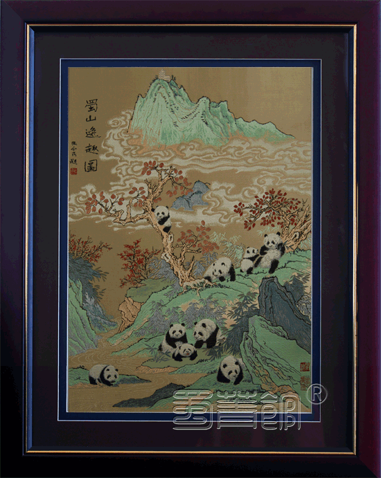 | 大熊猫被称为“国宝”,深受世界人民喜爱。现全球仅有野生大熊猫一千余只,其中绝大部分都生活在四川的山野中。为保护好这一珍宝,四川先后在汶川、雅安、成都等地建立了多个研究基地,对大熊猫的繁育、生存等课题进行科学研究,已取得了丰硕的成果。蜀锦《蜀山逸趣图》以传统七重纬工艺织造而成,画面色彩明艳,具很强的立体感,充分表现现出大熊猫母子生动和谐的生活场景,是一幅非常写实的大熊猫传统工艺品。在此,特别鸣谢有着“熊猫爸爸”之称的张和民先生为本品题名。 |