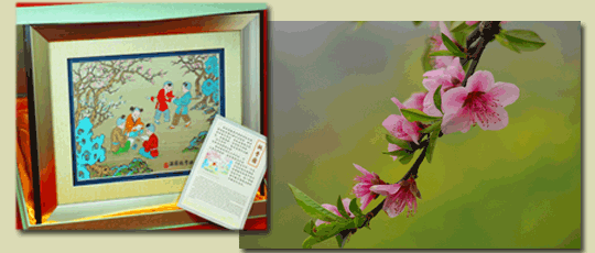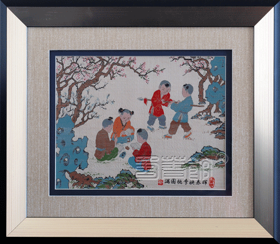 尊师重教是中国的传统美德,蜀锦桃李图以教育为题材,桃李园中童子学习、练武寓意能文能武、全面发展;五个童子暗喻五子登科; 桃李满园形容教育取得的丰硕成果。该锦应用传统工艺手法,并大量使用换套,使得画面色彩更为丰富多彩;片色、晕色等技法的应用,使画面中的童子更为生动可爱。是一幅适应于教育领域及谢师的最佳纪念品。