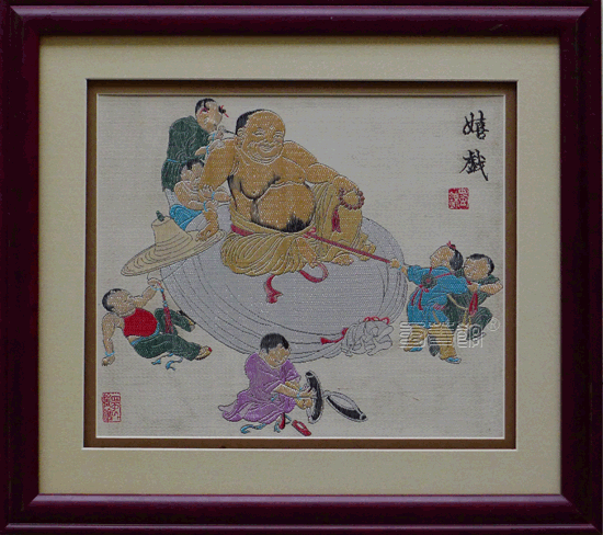 蜀锦《嬉戏》以传统图案为基础,依照蜀锦特点进行重新设计,将顽皮童子的天真烂漫与布袋和尚的大度宽容表现得淋漓尽致。该锦以七重纬织造,并应用“换套”、“晕色”等技法,力求表现出色彩丰富的孩童服饰。