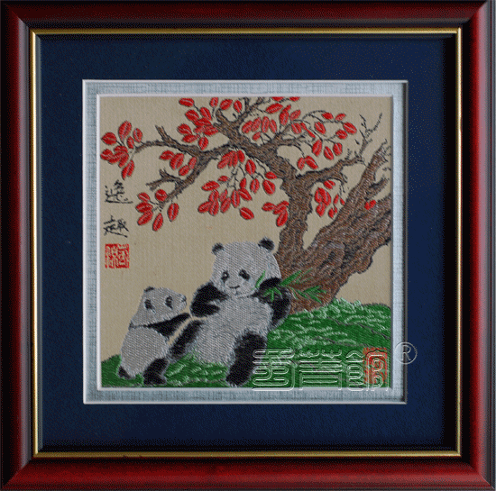 大熊猫被称为“国宝”,深受世界人民喜爱。现全球仅有野生大熊猫一千余只,其中绝大部分都生活在四川的山野中。为保护好这一珍宝,四川先后在汶川、雅安、成都等地建立了多个研究基地,对大熊猫的繁育、生存等课题进行科学研究,已取得了丰硕的成果。 蜀锦《逸趣》截取蜀菁馆版权图案《蜀山逸趣图》部分画面,以传统七重纬工艺织造而成,画面色彩明艳,具很强的立体感,充分表现现出大熊猫母子生动和谐的生活场景,是一幅非常写实的大熊猫传统工艺品。 在此,特别鸣谢有着“熊猫爸爸”之称的张和民先生为本品题名。